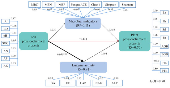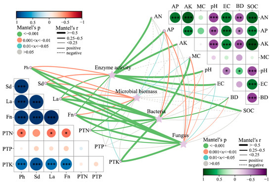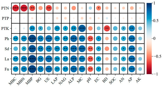 Soil pH was measured in a 1:2.5 soil-to-water suspension using a digital pH meter [8]. Gravimetric soil moisture content was determined via oven-drying at 105 °C [9]. Bulk density was measured using the core method, and porosity was calculated accordingly [10]. Available nitrogen (AN) was quantified by alkaline hydrolysis diffusion, available phosphorus (AP) by molybdenum–antimony colorimetry, and available potassium (AK) by flame photometry [11]. Soil organic carbon (SOC) was determined by dichromate oxidation–ferrous sulfate titration [12]. Microbial biomass carbon (MBC), nitrogen (MBN), and phosphorus (MBP) were analyzed via chloroform fumigation–extraction [13] to assess microbial nutrient pools.