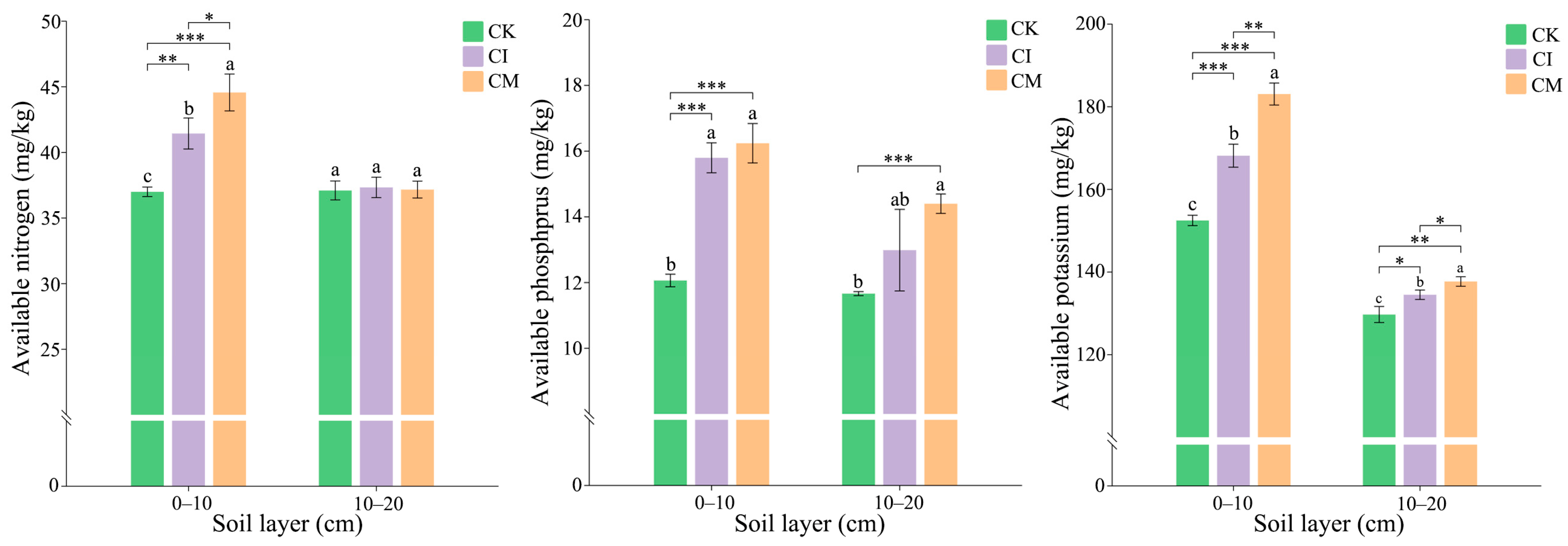 | 0–10 cm | CK | 8.59 ± 0.03 a | 0.11 ± 0.02 b | 14.98 ± 0.02 c | 1.23 ± 0.03 b | 16.25 ± 0.90 c |