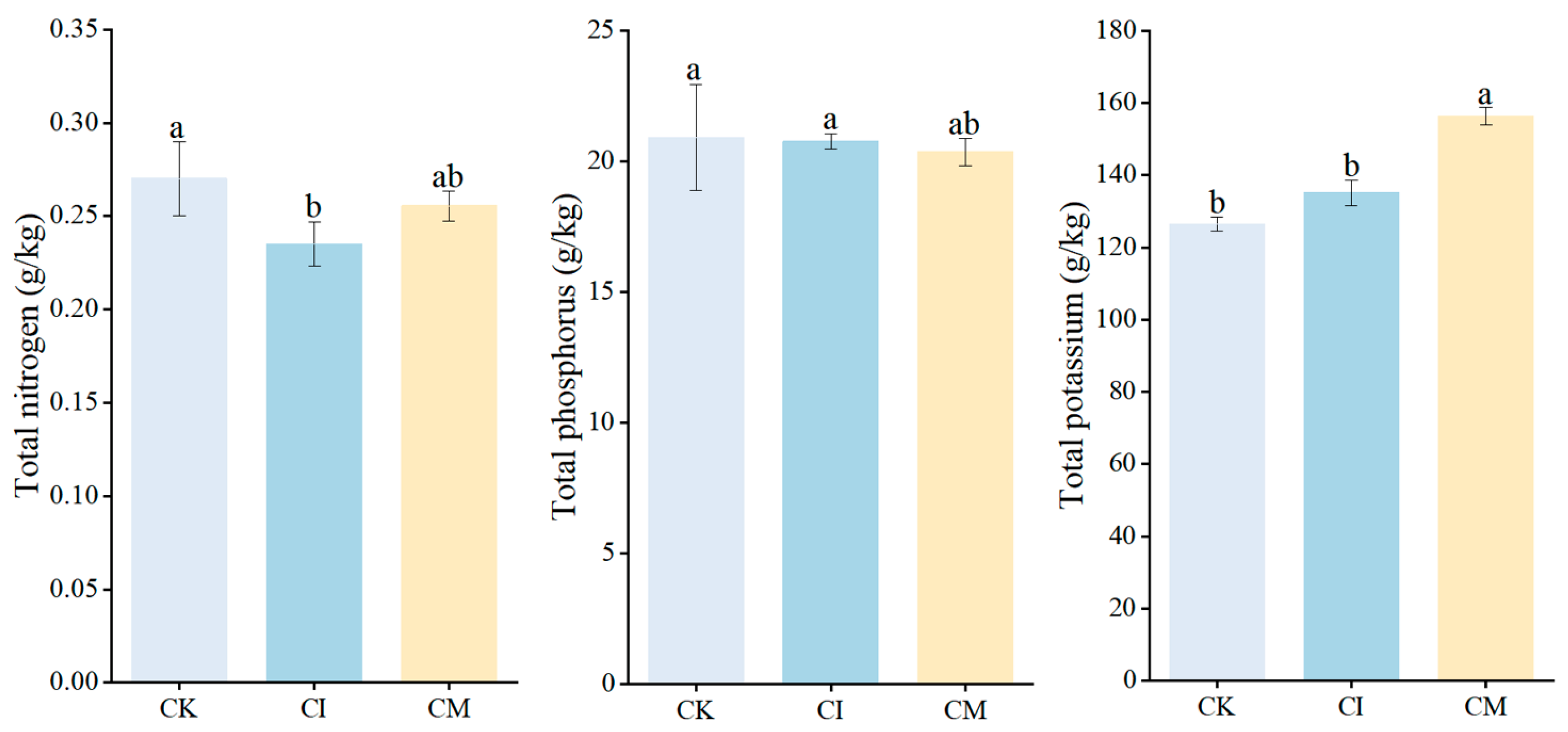 | CM | 8.64 ± 0.04 b | 0.13 ± 0.01 b | 26.51 ± 0.20 a | 1.23 ± 0.01 b | 15.32 ± 0.10 a |