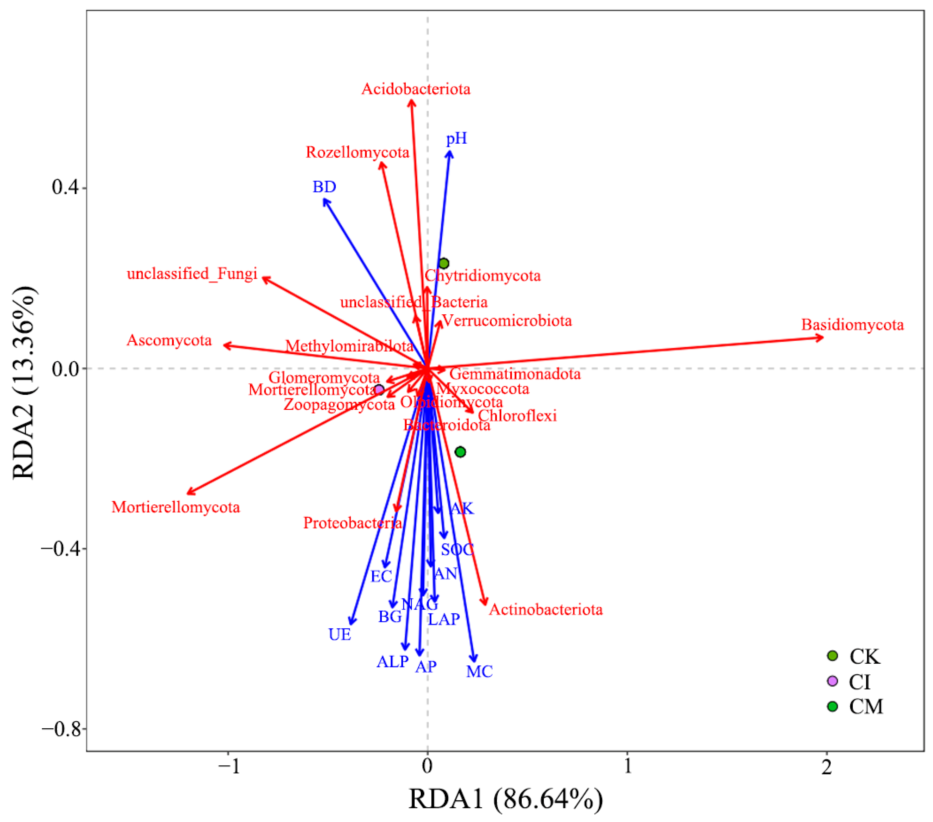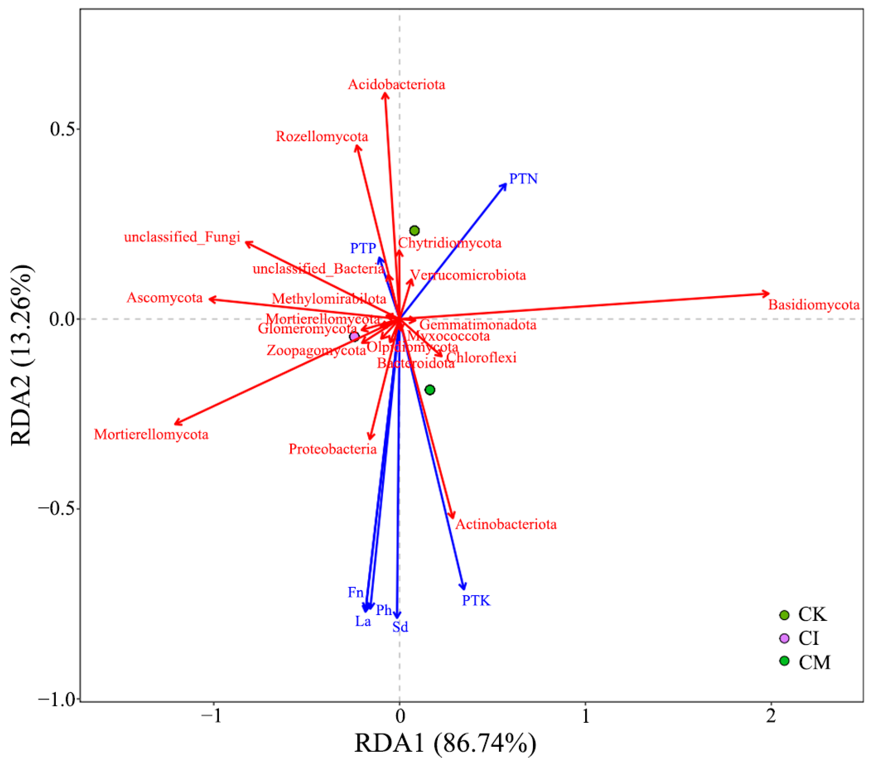 3.7. Redundancy Analysis of Soil Properties, Enzyme Activity, Plant Traits and Microbial Communities