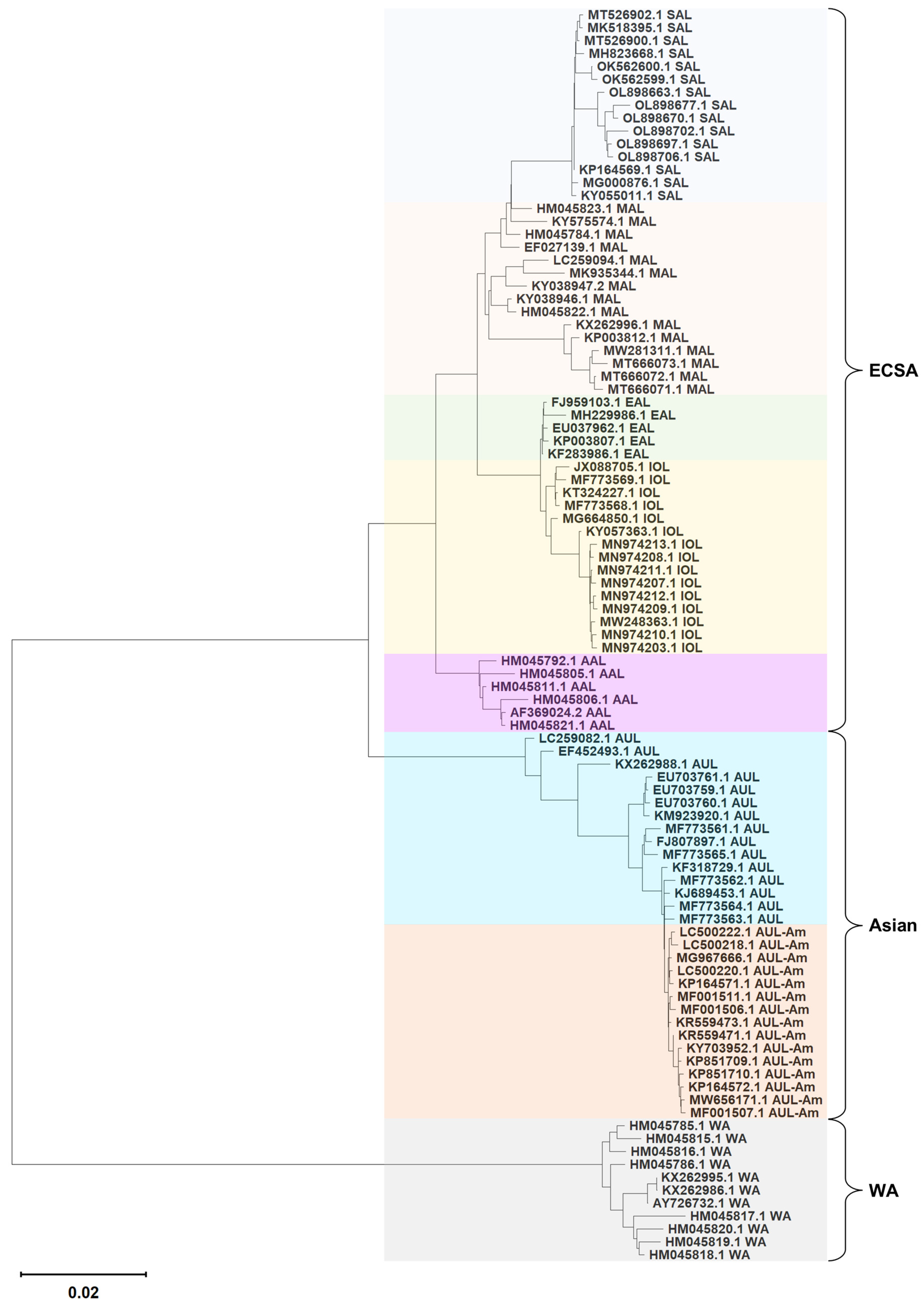 - Xiao, P.; Hao, Y.; Yuan, Y.; Ma, W.; Li, Y.; Zhang, H.; Li, N. Emerging West African Genotype Chikungunya Virus in Mosquito Virome. Virulence 2025, 16, 2444686. [Google Scholar] [CrossRef]