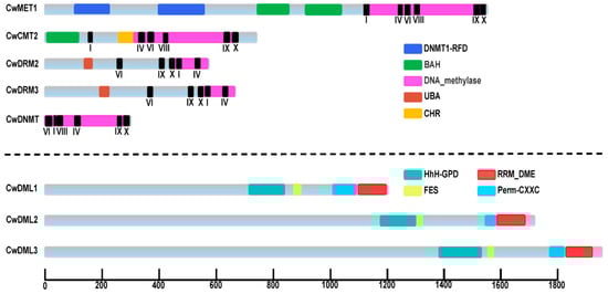Protein sequence analysis revealed that the C-terminal of CwC5-MTases contains the conserved DNA_methylase domain responsible for catalytic function, while their N-terminal possesses domains characteristic of their respective subfamilies. CwMET1, which belongs to the MET subfamily, harbored two bromo-adjacent homology (BAH) domains at its N-terminus. CwCMT2, a member of the CMT subfamily, had only one BAH domain. The DRM group comprised two members, CwDRM2 and CwDRM3, which featured a ubiquitin-associated (UBA) domain in their N-terminal. The last one is CwDNMT, with no N-terminal conserved domains. Future analysis of the C-terminal region of the CwC5-MTases identified several conserved motifs (I, IV, VI, VIII, IX, and X), arranged in a specific order across different subfamilies (Figure 1 and Figures S1–S4). In addition, the C-terminal of CwDML1/2/3 proteins also contains three conserved regions, region A (Figure 1, Figure S5 orange underline), glycosylase region (Figure 1, Figure S5 purple underline), and region B (Figure 1, Figure S5 red underline), which are discontinuous and interspersed with poorly conserved regions. The glycosylase region includes a HhH-GDP domain and a FES domain, while a Perm-CXXC and an RRM_DME (Figure 1, Figure S5 blue frame) are located in region B.