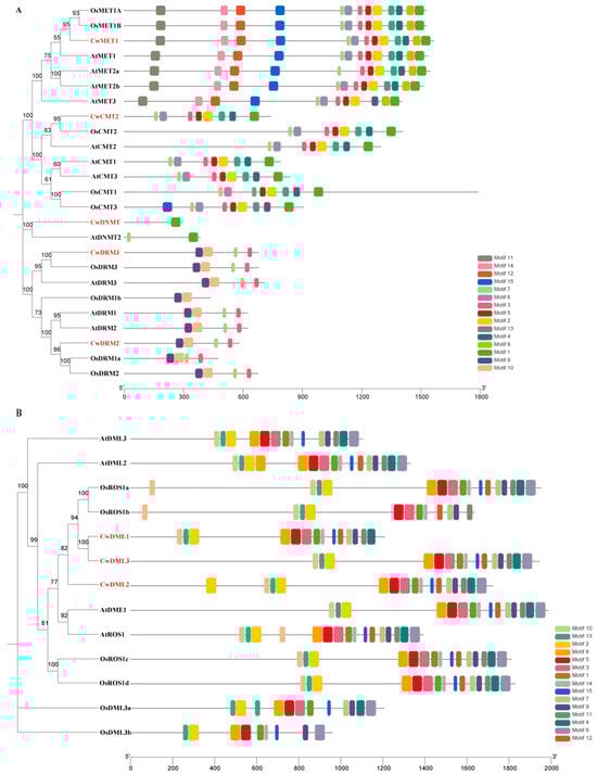 To further investigate the conservation and divergence of CwC5-MTase and CwdMTase proteins, conserved motifs were analyzed using the online Multiple Expectation Maximization for Motif Elicitation (MEME) software suite (version 5.5.7; https://meme-suite.org/meme/tools/meme, accessed on 29 November 2025). Full-length amino acid sequences of C5-MTase and dMTase proteins from C. wenyujin, A. thaliana, and O. sativa were submitted following the MEME instructions, with parameters set to identify 15 motifs with a width ranging from 6 to 50 amino acids. The resulting motif map was visualized using TBtools v1.09 [45] (Figure 3). The conserved motif sequence information is listed in Figures S6 and S7.