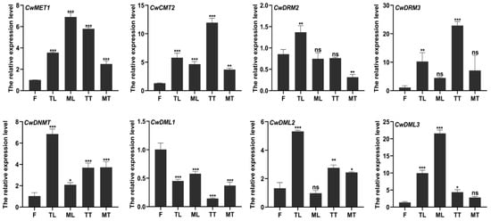 Transcript levels of CwC5-MTase and CwdMTase genes in three C. wenyujin organs. F, flowers; TL, tender leaves; ML, mature leaves; TT, tender tubers; MT, mature tubers. The symbols “ns, *, **, and ***” indicate significant differences at (p > 0.05), (p < 0.05), (p < 0.0003), and (p < 0.0002) using Duncan’s multiple range test. Means ± standard deviation (S.D.) are shown. Three biological replicates and three technical replicates were conducted for each data point.