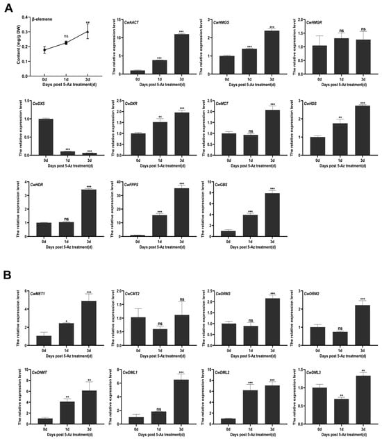 Effects of 100 μM 5-Az on the content of β-elemene and the expression of genes involved in the terpene backbone biosynthesis pathway (A) and CwC5-MTase and CwdMTase genes (B) in C. wenyujin. The symbols “ns, *, **, and ***” indicate the significant difference at (p > 0.05), (p < 0.05), (p < 0.0003), and (p < 0.0002) using Duncan’s multiple range test. Means ± standard deviation (S.D.) are shown. Three biological replicates and three technological replicates were conducted for each data point.