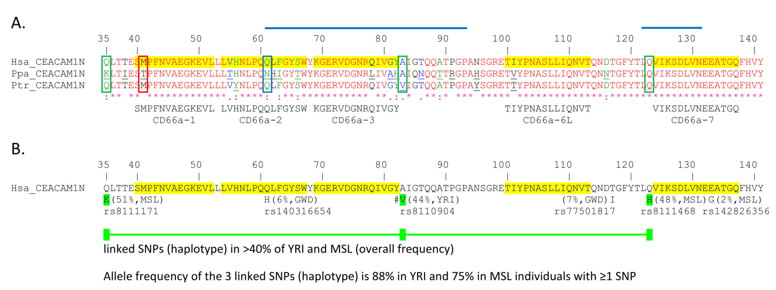 - Chang, C.L.; Semyonov, J.; Cheng, P.J.; Huang, S.Y.; Park, J.I.; Tsai, H.J.; Lin, C.Y.; Grutzner, F.; Soong, Y.K.; Cai, J.J.; et al. Widespread divergence of the CEACAM/PSG genes in vertebrates and humans suggests sensitivity to selection. PLoS ONE 2013, 8, e61701. [Google Scholar] [CrossRef]