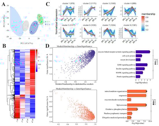 Transcriptomic analysis of different types of PFs in zebrafish. (A) Principal component analysis of Transcriptome. (B) Differential gene clustering heat map. (C) Divided into 8 clusters according to gene expression patterns. (D) Two gene expression clusters correlate highly with PF development and their functional enrichment (GO and KEGG) in WGCNA.