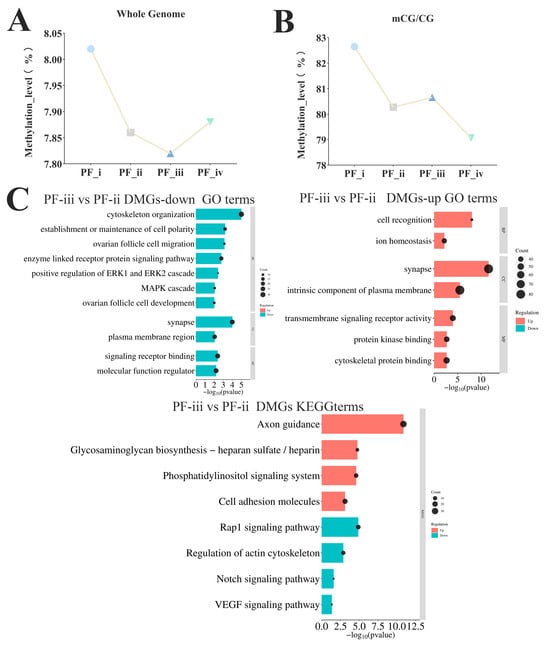 The results of circos plots showed that the changes in DNA methylation levels of differential methylation regions (DMRs) (p-value ≤ 0.001, DMR ≥ 0.2) were significantly more sites with increased methylation levels from the PF-ii to PF-iii stage (Figure S5). Functionally enriched terms in DMRs (PF-ii to PF-iii stage) were mainly involved in biological activities such as the maintenance of cell polarity and cell macromolecular localization, and KEGG results showed that the regions were enriched in the Notch and VEGF signaling pathways (Figure 3C).