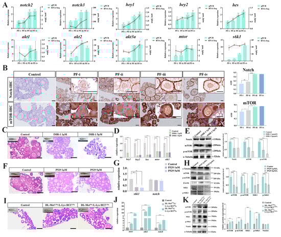 Regulatory effect of Notch/mTOR on the developmental process of PFs in zebrafish. (A) qRT-PCR to detect the expression of notch2, akt2, and mtor genes in different types of PFs in zebrafish. (B) Immunohistochemistry (IHC) to detect the Notch and mTOR proteins localization in the ovary and expression of different types of PFs of zebrafish; scale bar, 50 μM; (C,F,I) Histological observation of the ovary in the treated group with IMR-1, P529, and dietary amino acid supplementation; scale bar, 100 μM. (D) The hey1, hey2, hes, mtor, and s6k1 mRNA levels in the ovary tissues of IMR-1-treated groups. (E) The Notch, mTOR, and p-mTOR protein levels were expressed in the ovarian tissues of IMR-1-treated groups. (G) The s6k1 and notch mRNA levels were expressed in the ovarian tissues of the P529-treated groups. (H) The mTOR, p-mTOR, S6K1, and p-S6K1 protein levels of expression in the ovarian tissues of the P529-treated groups. (J) The mtor, s6k1, and notch mRNA levels of expression in the ovarian tissues of the amino acid addition group. (K) The mTOR, p-mTOR, S6K1, P-S6K1, and Notch protein levels were expressed in the ovarian tissues of the amino acid addition group. “*”: p < 0.05; “**”: p < 0.01; “***”: p < 0.001; “****”: p < 0.0001. (means ± SD of relative expression; n = 3 for each group).