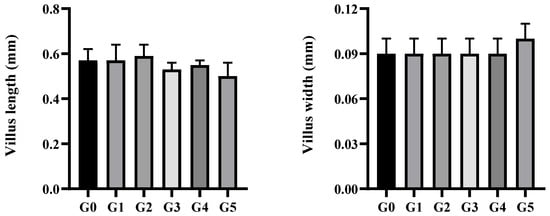 Intestinal structure of Micropterus salmoides fed diets supplemented with 0 (G0), 2.5 (G1), 5.0 (G2), 10.0 (G3), 20.0 (G4), and 40.0 (G5) g kg−1 Eucalyptus biochar (mean ± SE, n = 9). Bars with different letters represent significant differences (p < 0.05).