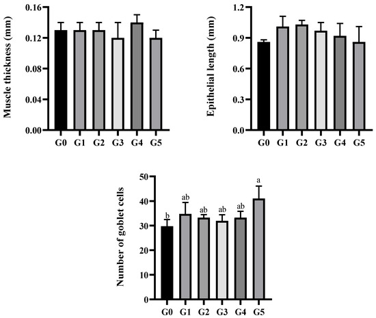 As shown in Figure 1, dietary Eucalyptus biochar supplementation influenced the intestinal morphology of M. salmoides. Goblet cell numbers increased steadily with increasing biochar levels and were significantly higher in the G5 group than in the control (p < 0.05). As illustrated in Figure 2, the mucosal and muscular layers across all treatments remained intact and well-organized. The mucosal layer contained numerous well-developed villi, while the muscle layer displayed clear structural integrity with uniform staining. The lamina propria consisted of connective tissue with sparse lymphocytic infiltration.