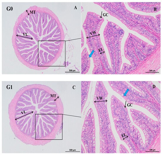 Intestinal histomorphology of Micropterus salmoides fed diets containing 0 (G0: (A,B)), 2.5 (G1: (C,D)), 5.0 (G2: (E,F)), 10.0 (G3: (G,H)), 20.0 (G4: (I,J)), and 40.0 (G5: (K,L)) g kg−1 Eucalyptus biochar. VL, villus length; MT, muscle layer thickness; VW, villus width; GC, goblet cells; EL, epithelial length. Scale bars: 500 μm (A,C,E,G,I,K) and 100 μm (B,D,F,H,J,L); blue arrow, lymphocyte infiltration.