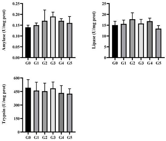 As shown in Figure 3, the activities of amylase, lipase, and trypsin did not differ significantly among the treatment groups (p > 0.05). However, amylase and lipase activities increased in groups G1–G4 compared with the control group (p > 0.05).