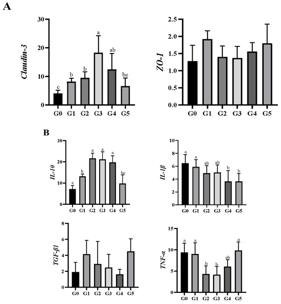 Intestinal gene expression levels of (A) tight junction-related and (B) inflammation-related markers in Micropterus salmoides fed diets containing 0 (G0), 2.5 (G1), 5.0 (G2), 10.0 (G3), 20.0 (G4), and 40.0 (G5) g kg−1 Eucalyptus biochar (mean ± SE, n = 9). Bars with different letters represent significant differences (p < 0.05).