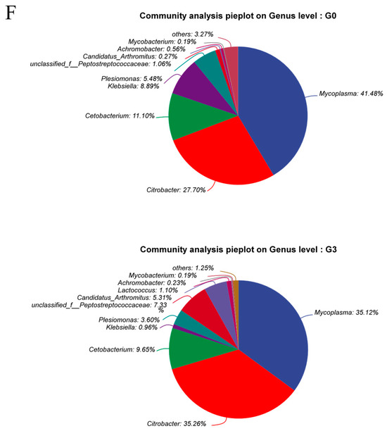 As shown in Figure 5C,E, the G3 group showed a higher relative abundance of Firmicutes compared with the control group, whereas Proteobacteria and Fusobacteria showed decreased relative abundances (p > 0.05). At the genus level (Figure 5D,F), the relative abundances of Citrobacter, Lactococcus, Candidatus Arthromitus, and unclassified Peptostreptococcaceae increased in the G3 group (p > 0.05). At the same time, Mycoplasma, Plesiomonas, and Klebsiella decreased relative to the control (p > 0.05).