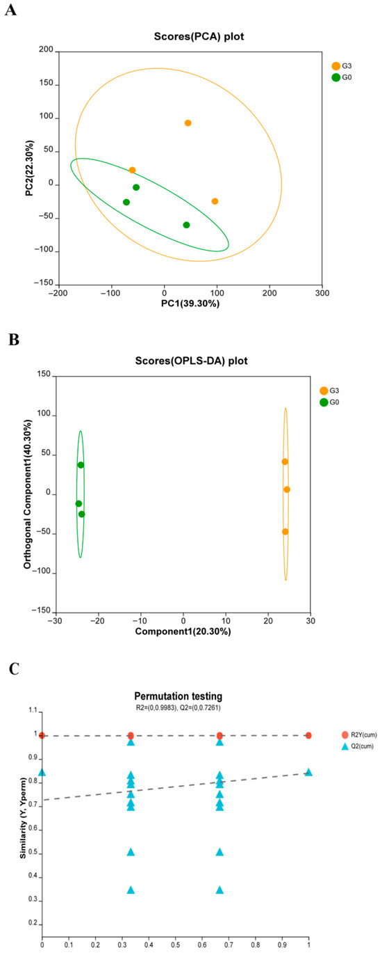 Multivariate analysis revealed a clear separation between the G3 and control groups. This distinction was visible in the PCA score plot and further supported by the distinct clustering observed in the OPLS-DA model (Figure 6A,B). All sample points in both models fell within the 95% confidence interval. Permutation testing (Figure 6C) confirmed the validity of the OPLS-DA model, with R2Y values exceeding 90% in all groups, indicating strong explanatory power. However, the Q2 regression line intercept was greater than 0.5, suggesting a potential risk of overfitting in the OPLS-DA model.