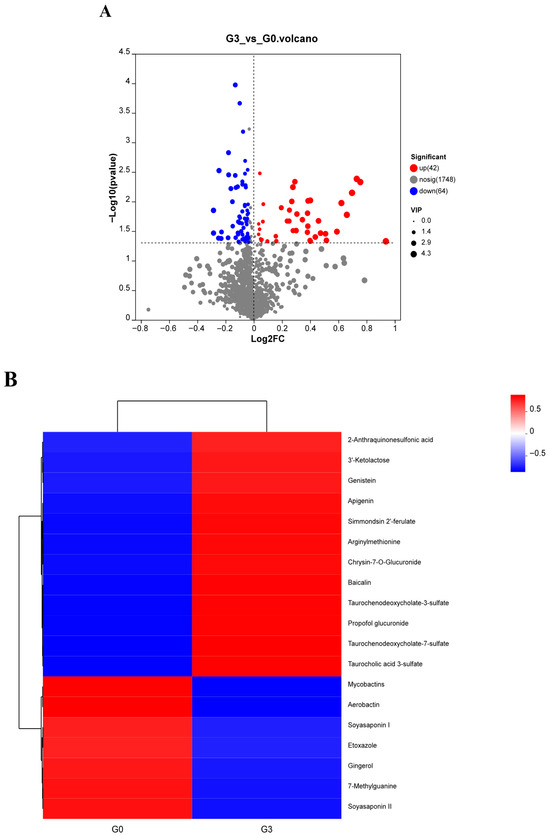 Using a significance threshold of p < 0.05 in the t-test and VIP > 1 in the OPLS-DA model, differential metabolites (DMs) between the two groups were identified and ranked by fold change. Compared with the control group, the G3 group demonstrated significant upregulation of 42 metabolites and downregulation of 64 metabolites (Figure 7A). Metabolites such as baicalin, genistein, apigenin, taurochenodeoxycholate-7-sulfate, taurocholic acid 3-sulfate, taurochenodeoxycholate-3-sulfate, and arginylmethionine were significantly elevated in the G3 group (p < 0.05), whereas aerobactin, mycobactins, soyasaponin, and etoxazole were significantly reduced (p < 0.05) (Figure 7B).