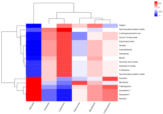Spearman correlation analysis between dominant intestinal bacterial genera and DMs showed that apigenin, propofol glucuronide, arginylmethionine, and macluraflavanone were strongly negatively correlated with Klebsiella (p < 0.01). Furthermore, 2-anthraquinonesulfonic acid and chrysin-7-O-glucuronide displayed significant negative correlations with Klebsiella (p < 0.05). Soyasaponin I, soyasaponin II, and etoxazole were also significantly negatively correlated with Lactococcus (p < 0.05) (Figure 9).