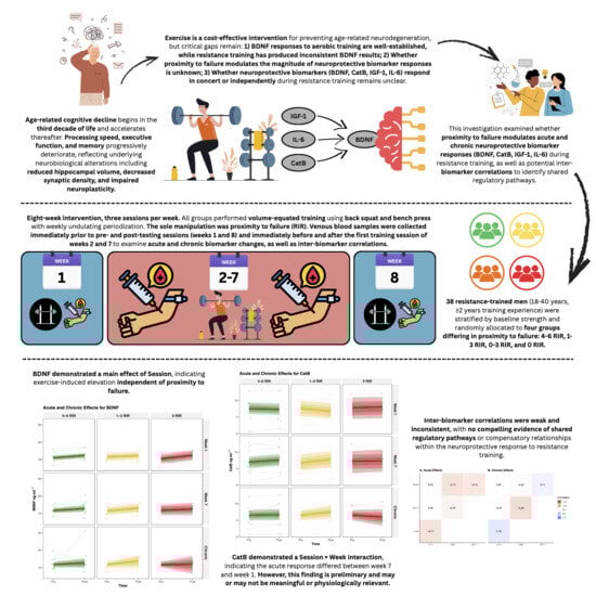 - Johnson, T.K.; Belcher, D.J.; Sousa, C.A.; Carzoli, J.P.; Visavadiya, N.P.; Khamoui, A.V.; Whitehurst, M.; Zourdos, M.C. Low-Volume Acute Multi-Joint Resistance Exercise Elicits a Circulating Brain-Derived Neurotrophic Factor Response but Not a Cathepsin B Response in Well-Trained Men. Appl. Physiol. Nutr. Metab. 2020, 45, 1332–1338. [Google Scholar] [CrossRef] [PubMed]