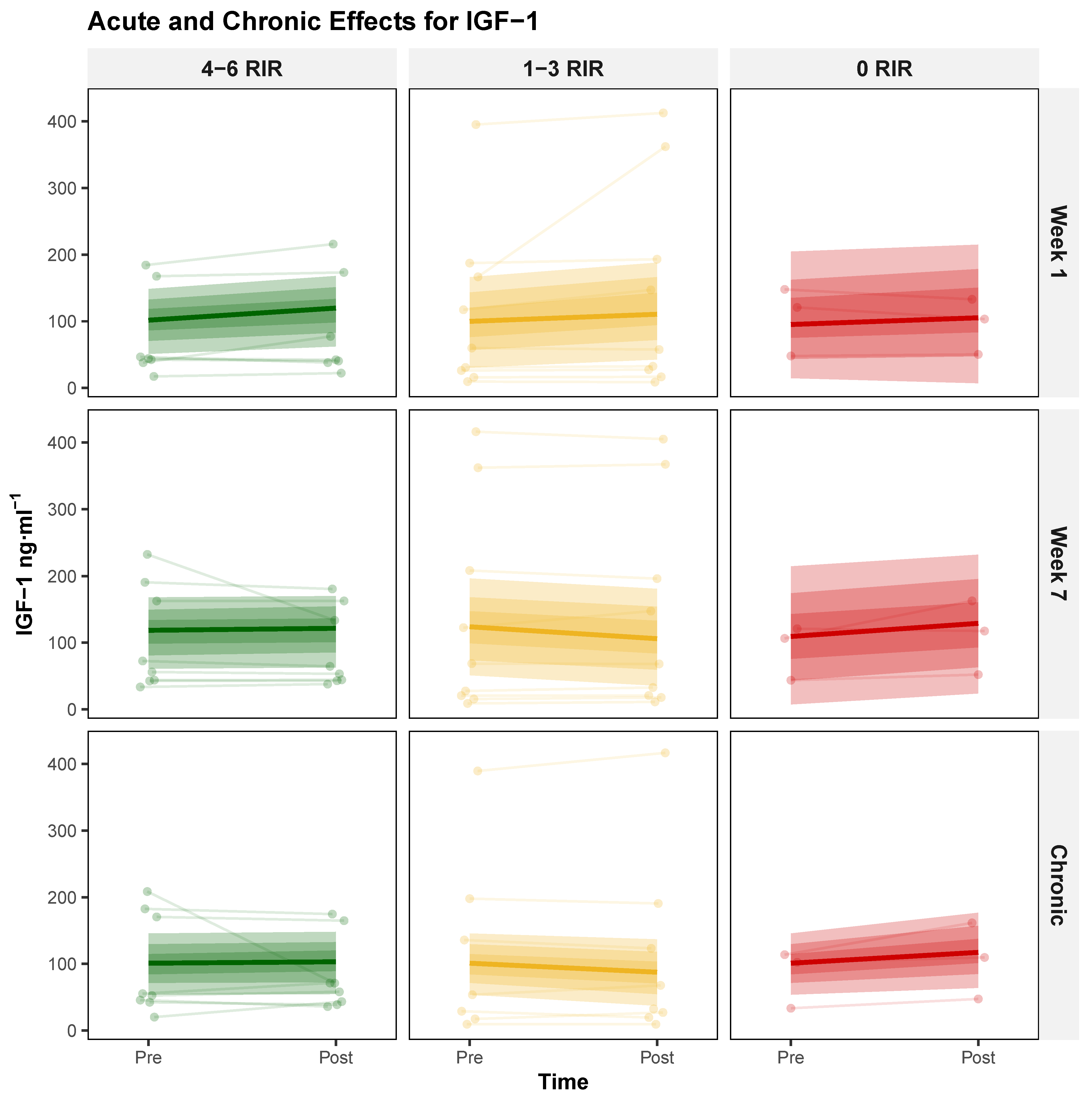 | IGF-1 | Chronic | Time × RIR | 6.38 | −2.86 | 16.08 | 92.25 | 54.60 |