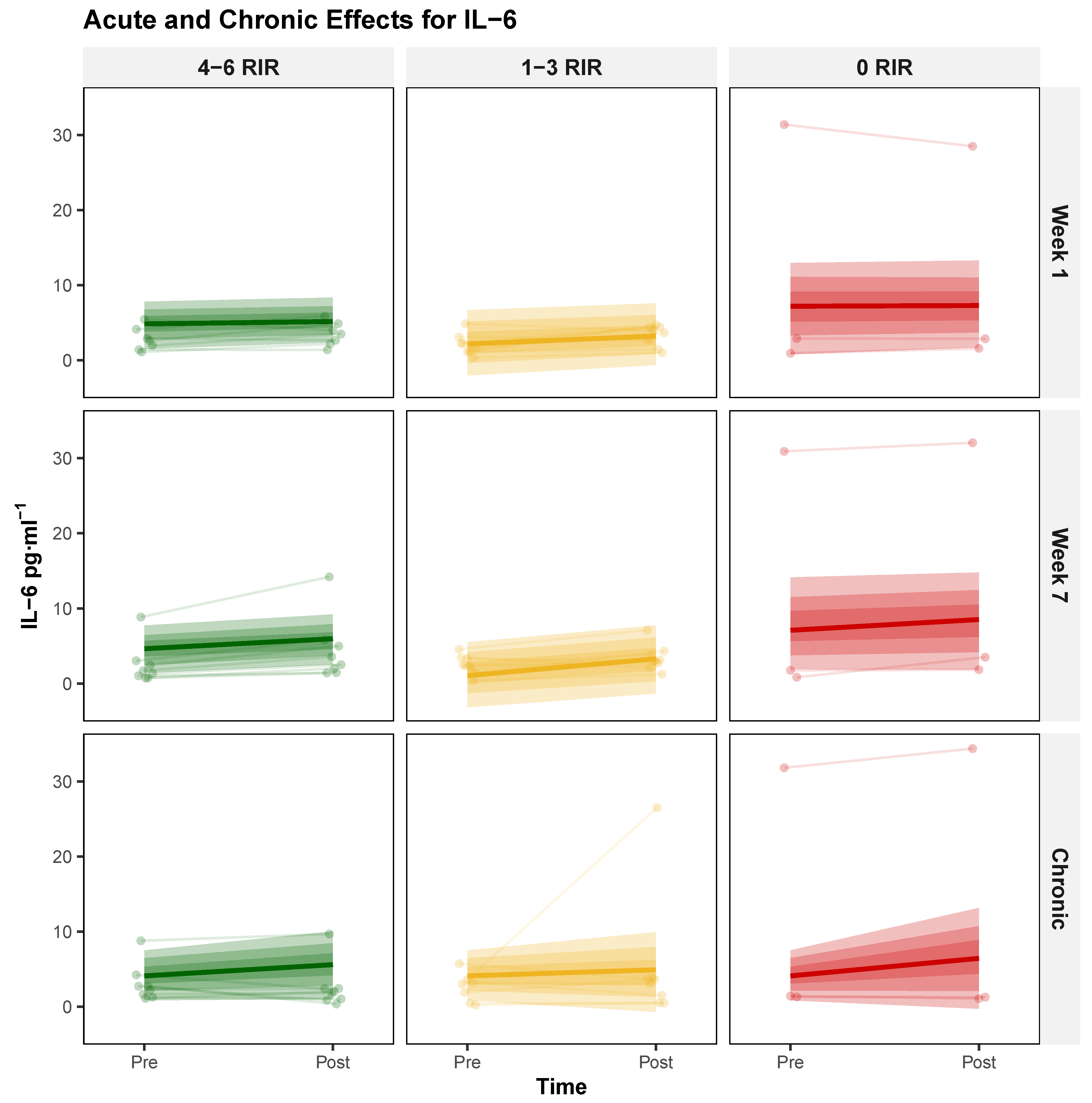 | IL-6 | Chronic | Time × RIR | 0.35 | −1.17 | 1.89 | 69.74 | 47.38 |