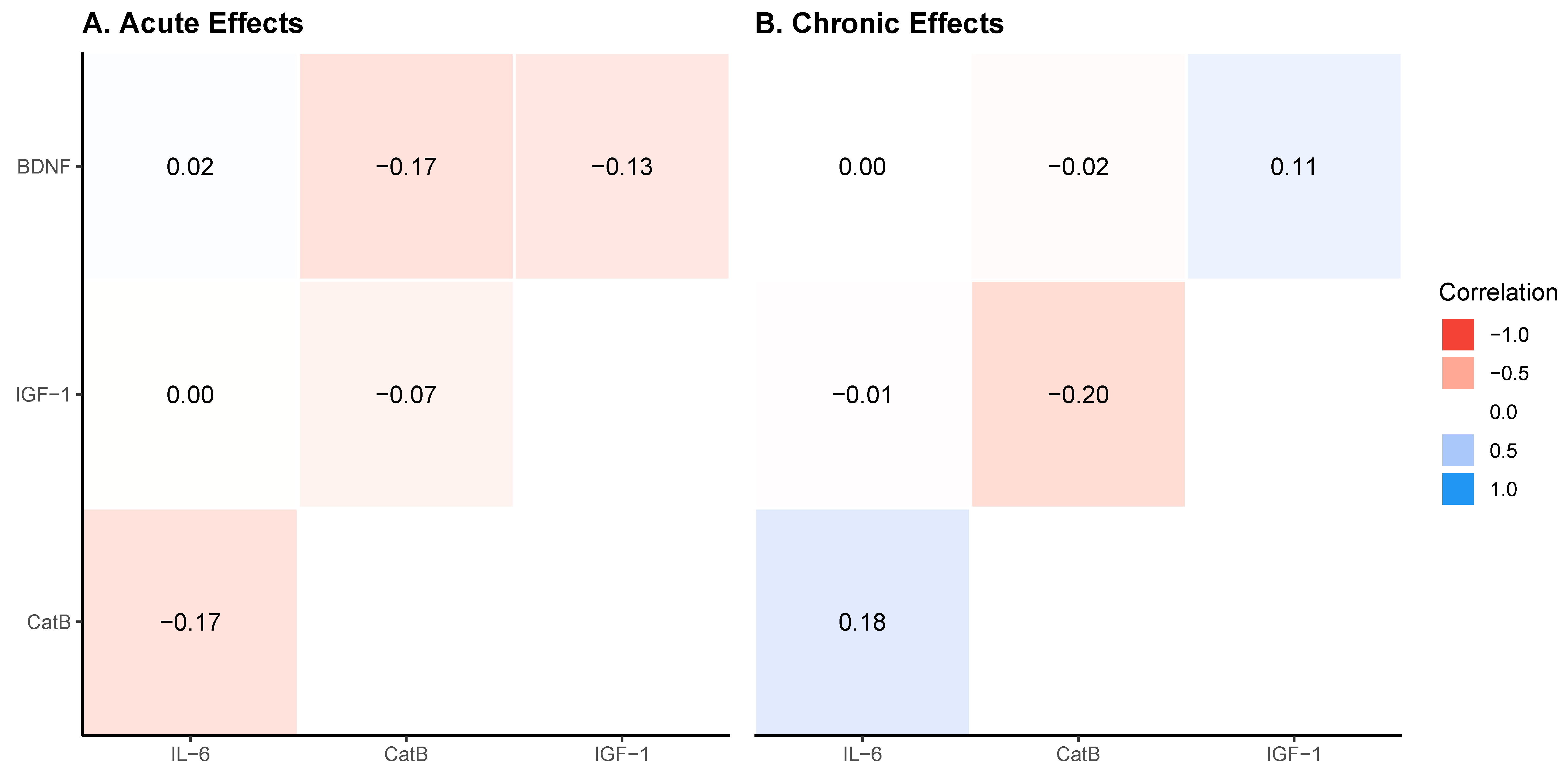 | Acute | BDNF | CatB | −0.16 | −0.49 | 0.20 |