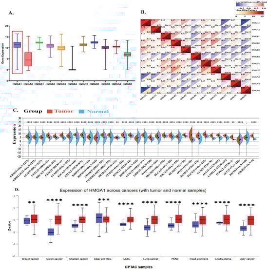 Pan−Cancer Overexpression and Clinical Significance of HMGA1 (A) Comparative expression analysis of HMG family genes across 33 TCGA tumor types. The red box highlights the HMGA1 cluster. (B) Co−Expression network and correlation coefficient among HMG family members across the TCGA Cohort (C) HMGA1 mRNA expression (log2 [x + 0.001]) analysis in tumors versus normal tissues based on integrated TCGA and GTEx datasets. (D) HMGA1 protein expression levels in 10 cancer types based on CPTAC datasets from the UALCAN portal. Red color represents tumor samples; blue represents normal tissue samples. Statistical Significance was determined by the unpaired Wilcoxon rank-sum test (** p < 0.01, *** p < 0.001, **** p < 0.0001).