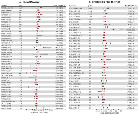 Prognostic significance of HMGA1 across cancers. (A) Overall survival (B) Progression free interval (PFI) in cancers.