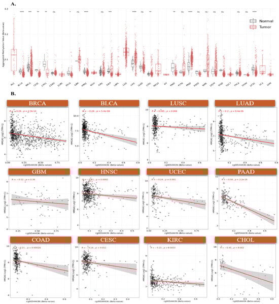 DNA methylation analysis of HMGA1 Island promoter regions. (A) Comparative analysis of aggregated methylation levels from seven HMGA1-associated probes across multiple cancers, (* p < 0.05, ** p < 0.01, *** p < 0.001, **** p < 0.001). (B) Correlation between DNA methylation at probe cg00544436 and HMGA1 expression in twelve tumor types. Colored dots represent individual samples for each tumor type (as labeled), and the gray shadow indicates the 95% confidence interval of the fitted trend line. ns indicates no significant difference.