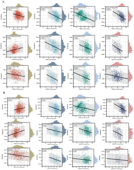 HMGA1 expression showed a strong positive correlation with stemness indices derived from RNA expression (RNAss) and DNA methylation (DNAss) in the majority of tumor types, particularly BRCA, LUAD, and STAD, indicating its association with de-differentiated tumor states. In contrast, a few cancer types such as KIPAN showed inverse correlations, suggesting context-dependent effects (Supplementary Figure S5). To evaluate how HMGA1 relates to the tumor microenvironment (TME), we examined ESTIMATE stromal and immune scores. HMGA1 was broadly associated with reduced stromal and immune scores in multiple cancers, consistent with an immune-excluded phenotype. However, several tumor types with positive correlations (e.g., GBMLGG, LGG, and SARC) are known to harbor immunosuppressive infiltrates, suggesting that HMGA1 may be linked to dysfunctional rather than effective immune presence. The strongest associations were observed in KIPAN, LUSC, STES, BRCA, STAD, HNSC, GBMLGG, NB, ESCA, COAD, SKCM and LUAD for stromal scores, and LUSC, GBMLGG, KIPAN, STES, HNSC, KIRC, SARC, PRAD, THCA, BRCA, LGG and LUAD for immune scores (Figure 5A,B).