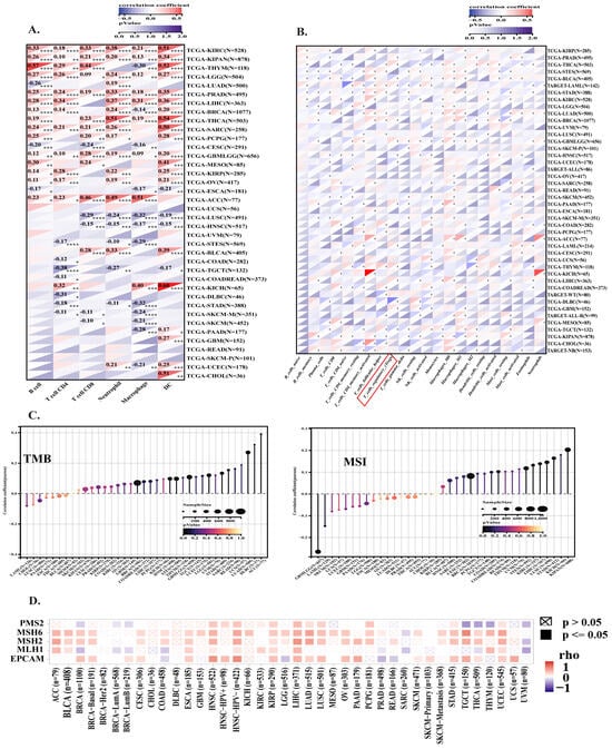 Associations of HMGA1 with immune infiltration, TMB, and MSI across cancers. (A) Correlation of HMGA1 with six major immune cell types across 38 cancers. (B) Heatmap of HMGA1 and 22 immune-cell subsets represented upregulation of T-regulatory cells among different cancers. (C) HMGA1 expression positively correlated with TMB and MSI in several cancers. (D) Correlations between HMGA1 and mismatch repair genes (EPCAM, MSH2, MSH6, and PMS2) across cancers. Statistical Significance is indicated as follows: (* p < 0.05, ** p < 0.01, *** p < 0.001, **** p < 0.001).