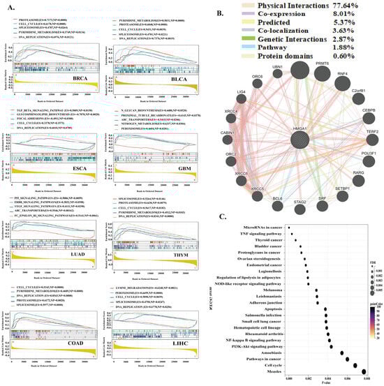 To define the oncogenic pathways driven by HMGA1, we performed Gene Set Enrichment Analysis (GSEA) across eight cancer types. This revealed that HMGA1 consistently activates a core set of pathways essential for rapid cell proliferation, including the cell cycle, DNA replication, pyrimidine metabolism, spliceosome, and proteasome, which were enriched in cancers such as BRCA, COAD, and LIHC. Beyond this universal signature, HMGA1 exhibited tissue-specific pathway alterations. In LUAD, it was associated with activation of oncogenic ERBB signaling and suppression of p53, whereas in ESCA, HMGA1 negatively regulated TGF-β signaling and focal adhesion, suggesting a context-dependent role in promoting invasion (Figure 7A). Protein–Protein interaction analysis positioned HMGA1 as a central hub linked to partners such as HMGA2 and PRMT6, primarily through physical and co-expression links (Figure 7B). Complementary Gene Ontology (GO) analysis further reinforced its involvement in mitotic processes, DNA repair, and microtubule indents (Figure 7C). Collectively these findings indicate that HMGA1 orchestrates a versatile oncogenic program, utilizing common proliferation and metabolic programs across cancers while modulating context-specific pathways to support tumor survival and progression.