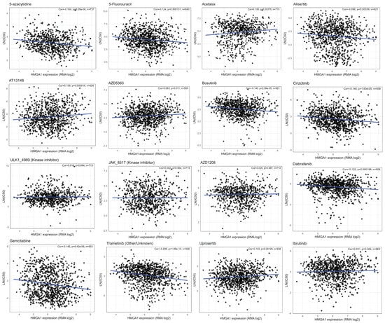 Across GDSC cell lines, HMGA1 expression showed two distinct correlation patterns with drug responses. Negative correlations (higher HMGA1 = lower LN (IC50), indicating greater sensitivity) were observed for several cytotoxic and targeted agents, including 5-azacytidine, 5-fluorouracil, gemcitabine, dabrafenib (BRAF inhibitor), crizotinib (ALK/MET inhibitor), alisertib (AURKA inhibitor), and bosutinib (SRC/ABL/SFK inhibitor). In contrast, positive correlations (higher HMGA1 = higher LN (IC50), indicating reduced sensitivity) were found for AZD5363/capivasertib and uprosertib (AKT inhibitors) and well as acetalax, suggesting a HMGA1-linked resistance phenotype. Several drugs demonstrated minimal or no linear association with HMGA1 levels, including ibrutinib, ULK_4989, JAK_8517, GSK266616AC, AZD1208 (Figure 8). In summary, these results reveals a clinically meaningful dichotomy: HMGA1-high tumors may be more sensitive to DNA-targeting antimetabolites and inhibitors of BRAF, ALK/MET, AURKA and SRC-family Kinases, while HMGA1-high tumors may exhibit intrinsic resistance to AKT-targeted therapies. These patterns provide mechanistic hypotheses for future validation and suggest that HMGA1 may serve as a dual-direction predictive biomarker depending on drug class.