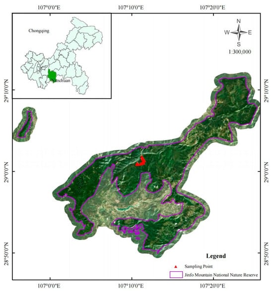 The study area is located within the Jinfo Mountain Karst World Heritage Site (106°54′–107°27′ E, 28°46′–29°38′ N), China [31]. The region features distinctive limestone karst formations, with mountains encompassing 98.79% of the land and boasting a maximum elevation drop of 1600 m. The highest peak reaches an elevation of 2238 m, whereas the lowest point lies at an elevation of 650 m above sea level [32]. The Jinfo Mountain Nature Reserve represents a typical subtropical humid monsoon climate zone characterized by distinct vertical climatic variations and four well-defined seasons. The reserve receives an average annual rainfall of approximately 1431 mm, with an average annual temperature of 8.3 °C and approximately 1173 h of sunshine per year. It is distinguished by limited sunlight exposure, frequent cloud cover, high humidity levels, and abundant precipitation [33]. Owing to the interaction of biological, climatic, and geological factors, the vertical distribution zone spectrum of soil exhibits distinct zonal and regional patterns. The region harbors a diverse vegetation community and boasts abundant natural resources, providing optimal conditions for the proliferation of numerous rare animal species. Its primary focus lies in safeguarding the subtropical forest ecosystem, with silver fir, forest musk deer, and black langurs serving as key conservation targets [5]. Additionally, C. utilis constitute a significant component of the resources in the Jinfo Mountain area, with its distribution ranging from 1300–2238 m above sea level. The C. utilis bamboo forest covers an extensive area of over 14,000 hectares, of which Nanchuan accounts for 10,033.05 hectares, representing 60% of the total forested area in Jinfo Mountain. Moreover, locally produced bamboo shoots serve as a vital economic resource for residents [34].