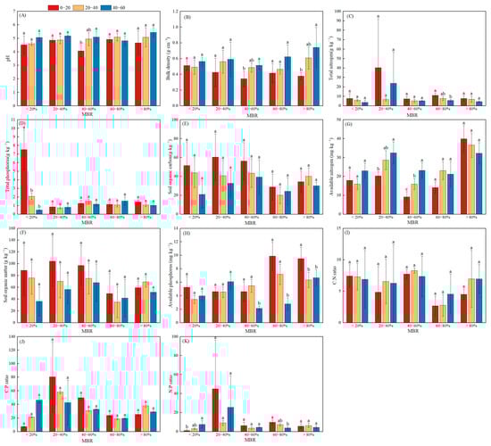 Soil nutrient variables and their stoichiometry with the expansion ratio of bamboo within the broad-leaved forest. (A) pH; (B) Bulk density; (C) Total nitrogen; (D) Total phosphorus; (E) Soil organic carbon; (F) Soil organic matter; (G) Available nitrogen; (H) Available phosphorus; (I) C:N ratio; (J) C:P ratio; (K) N:P ratio. Different lowercase letters indicate significant differences between different patches of the same soil depth (p < 0.05).