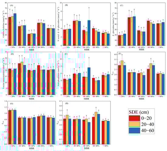 Soil enzyme activities and their stoichiometry at different soil depths and expansion ratios of bamboo within the broad-leaved forest. (A) Cellulose hydrolase; (B) N-acetyl-β-D-glucosidase; (C) β-glucosidase; (D) Leucine aminopeptidase; (E) Acid phosphorus; (F) EC:N; (G) EC:P; (H) EN:P. Different lowercase letters indicate significant differences between different patches of the same soil depth (p < 0.05).