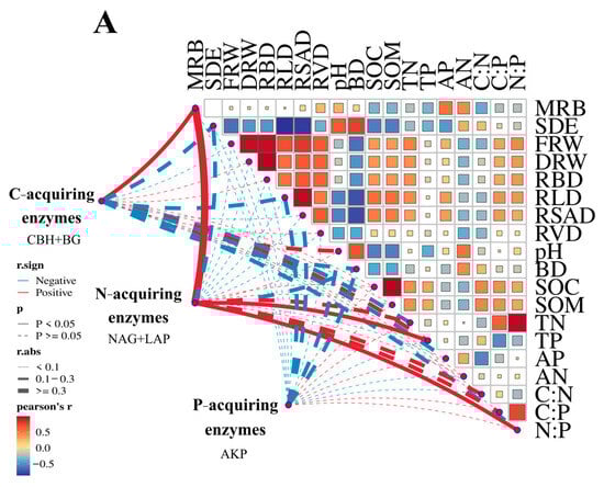 Diagrams demonstrating significant positive and negative correlations between soil variables and soil enzyme activities, as well as the soil enzyme stoichiometric ratio (A,B).