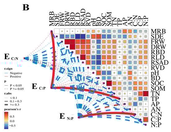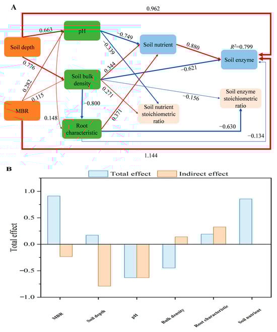 SEM analysis revealed the effects of root characteristics, soil nutrients, the soil nutrient stoichiometric ratio, soil depth, and MRB on the soil enzyme and soil enzyme stoichiometric ratios (Figure 5). The soil nutrient levels were significantly and positively correlated with the soil bulk density (path coefficient = 0.344) and root characteristics (path coefficient = 0.371) and showed an inverse relationship with the pH values (path coefficient = −0.749). Moreover, the soil nutrient content positively influenced the soil enzyme activity (path coefficient = 0.880) but negatively affected the soil pH (path coefficient = −0.749). Furthermore, soil enzyme activity was directly influenced by soil nutrients, soil depth (path coefficient = 0.962), and MRB (path coefficient = 1.144), indicating that these factors are key drivers of belowground biochemical processes. Soil enzyme activity was indirectly influenced by the soil bulk density (path coefficient = −0.621) and root characteristics (path coefficient = −0.134). In addition, the soil enzyme stoichiometric ratio was indirectly influenced by the soil bulk density (path coefficient = −0.156) and root characteristics (−0.630), indicating that physical soil properties and root system morphology play a role in regulating belowground biochemical processes.