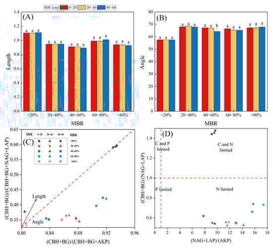 The vector length initially decreases and then increases as the MRB increases. Notably, the vector length reaches its peak in forests with the lowest MRB (<20%) (Figure 6), indicating that carbon limitation is most pronounced under the lowest MRB (< 20%), where it exceeds the values recorded in forests with MRB ranges of 20–40%, 40–60%, and 60–80% by factors of 1.35, 1.44, and 1.08, respectively. With the exception of the 20–40% MRB condition, where the vector length increases consistently with soil depth, the vector length initially increases and then decreases as the soil depth increases under all other MRB conditions. Specifically, the maximum vector length is observed at a soil depth of 20–40 cm, which corresponds to the greatest degree of C limitation. Additionally, the ratio of (CBH + BG) to (NAG + LAP) is less than 1 under all MRB conditions, except for the lowest MRB (<20%), where it exceeds 1. This suggests that both C and P limitations are present at the lowest MRB (<20%), whereas other MRB ranges exhibit only P limitation without C limitation. Furthermore, all the vector angles in the forest are greater than 45°, indicating that the soil in the bamboo forest is subject to phosphorus limitation. The vector angle increases gradually with increasing MRB, reaches the maximum value at 40–60% MRB, and then rapidly decreases to the minimum value at 60–80% MRB. Notably, all the vector angles at the 20–40 cm soil depth presented a minimum value. Overall, P limitation clearly reached its maximum at 60–80% MRB and at soil depths of 20–40 cm.