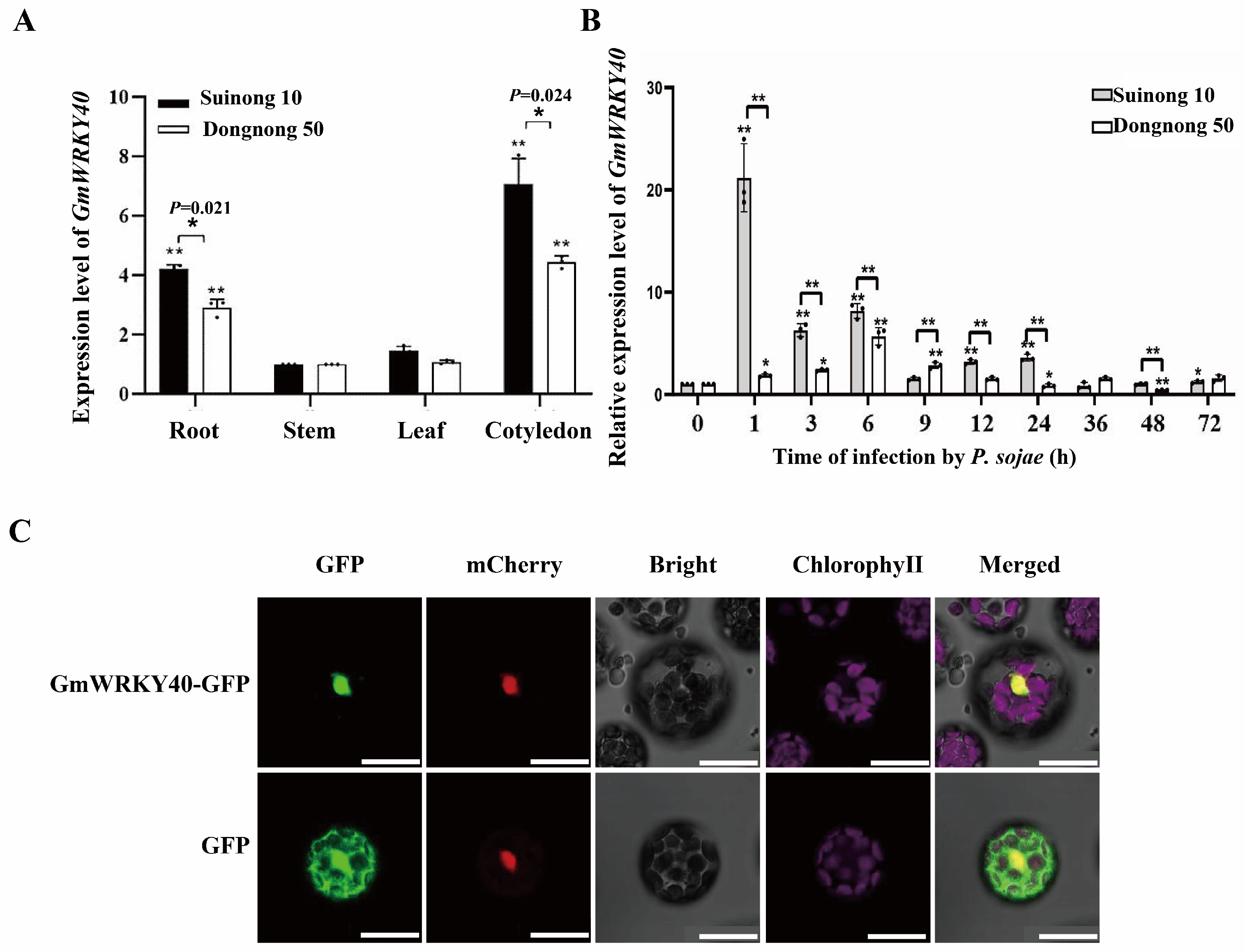 Figure 1. The expression profile and subcellular localization of GmWRKY40. (A) The Basal expression levels of GmWRKY40 in various tissues from the resistant (‘Suinong 10’) and susceptible (‘Dongnong 50’) soybean cultivars. (B) The time-course analysis of GmWRKY40 transcript levels via qRT-PCR in both cultivars following P. sojae inoculation (0–72 hpi). GmEF1β and GmTUB4 were used for normalization. Data are presented as mean ± SD (n = 3 biological replicates). The data were confirmed to follow a normal distribution. Statistical significance was determined by Student’s t-test (* p < 0.05, ** p < 0.01). (C) Subcellular localization of GmWRKY40. Confocal microscopy of Arabidopsis protoplasts co-expressing either GmWRKY40-GFP or a GFP control with the nuclear marker H2B-mCherry. Scale bar = 25 µm.