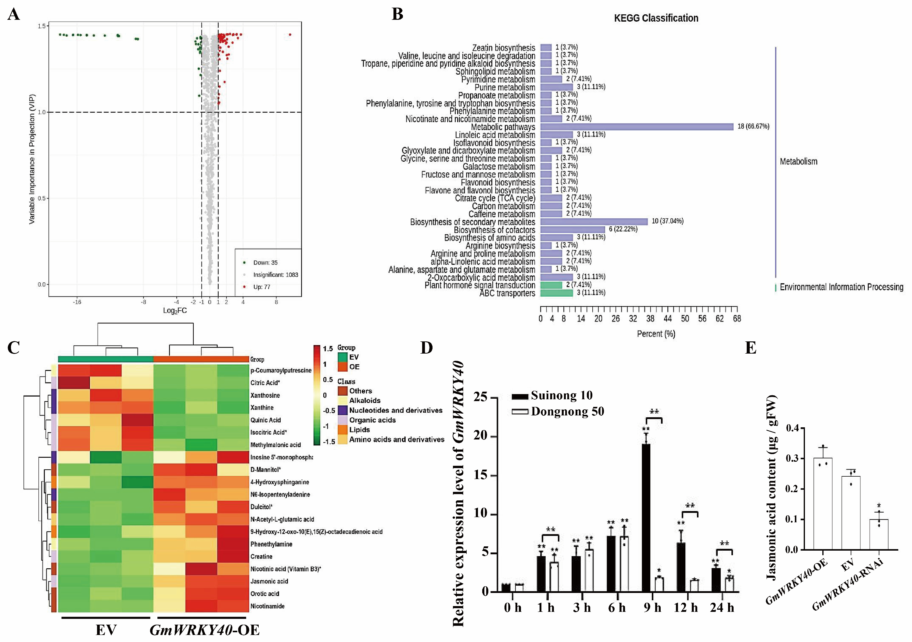 Figure 3. Metabolic and hormonal responses modulated by GmWRKY40 in soybean. (A) The Volcano plot of differentially accumulated metabolites (DAMs) in GmWRKY40−OE vs. EV hairy roots. Red/green dots indicate metabolites with significant upregulation/downregulation (|log2FC| > 1, p < 0.05). (B) The KEGG functional annotation of DAMs, categorized by major metabolic pathways. (C) The hierarchical clustering heatmap of key stress-associated DAMs, with the color scale representing log2 (fold-change). (D) Transcriptional induction of GmWRKY40 by MeJA in leaves of resistant (‘Suinong 10’) and susceptible (‘Dongnong 50’) soybean cultivars (* p < 0.05, ** p < 0.01, Student’s t-test). (E) The endogenous JA content in transgenic hairy roots with altered GmWRKY40 expression (OE, RNAi) compared to the empty vector (EV) control. Data in (AE) are from three biological replicates, with results for (D,E) presented as mean ± SD (n = 3 biological replicates). The data were confirmed to follow a normal distribution. Asterisks denote significant differences in (D,E) compared to the EV control (* p < 0.05, Student’s t-test).