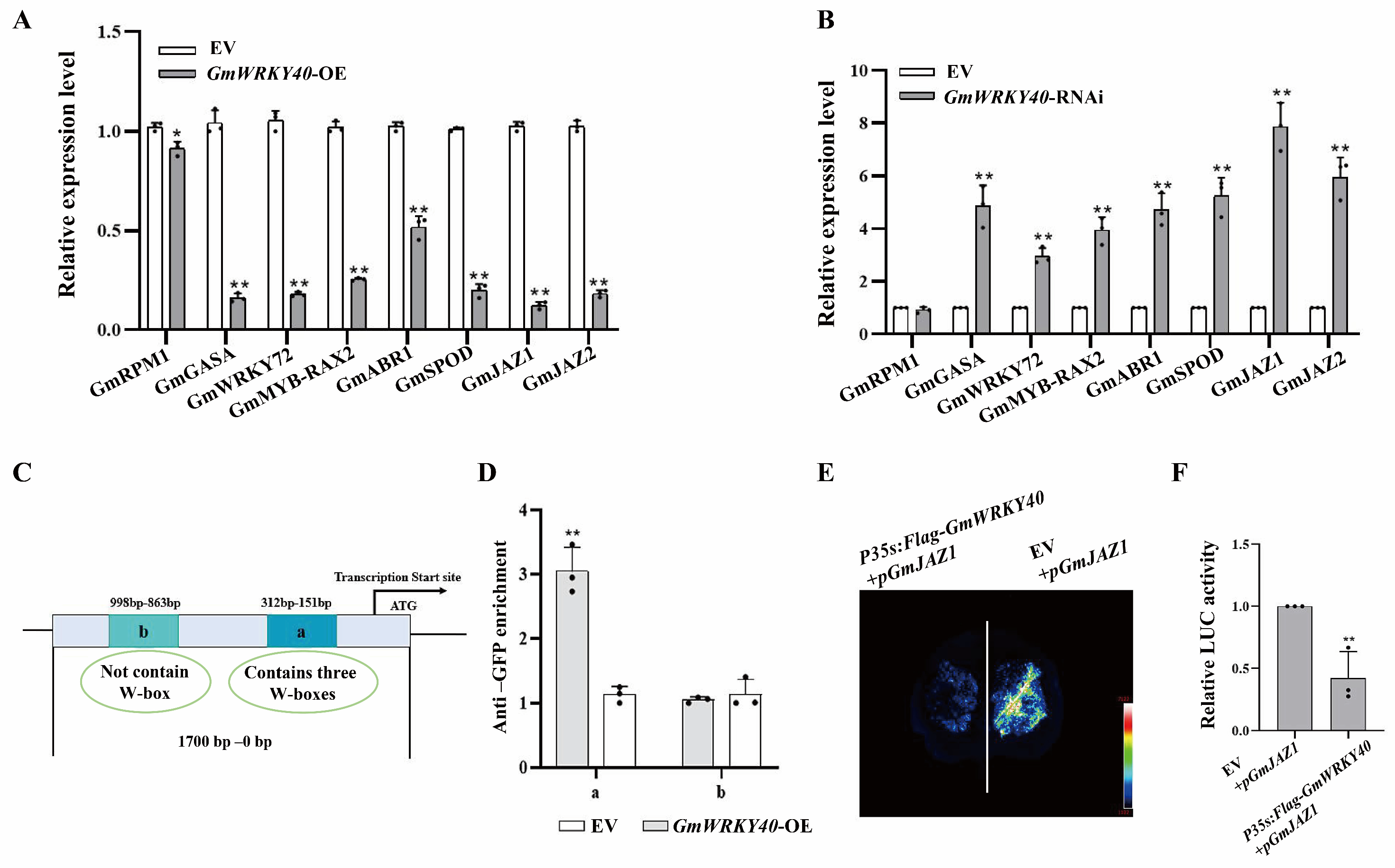 To determine if GmWRKY40 directly regulates GmJAZ1 transcription, we conducted a dual-luciferase reporter assay in N. benthamiana leaves. An effector construct expressing GmWRKY40-MYC was co-expressed with a reporter construct where the GmJAZ1 promoter drove LUC expression (pGmJAZ1:LUC). Compared to the empty vector (EV) control, co-expression with GmWRKY40 significantly repressed the activity of the GmJAZ1 promoter. This was evident from both the visibly reduced luminescence signal (Figure 4E) and the significantly lower LUC/REN activity ratio (Figure 4F), confirming that GmWRKY40 functions as a transcriptional repressor of GmJAZ1.