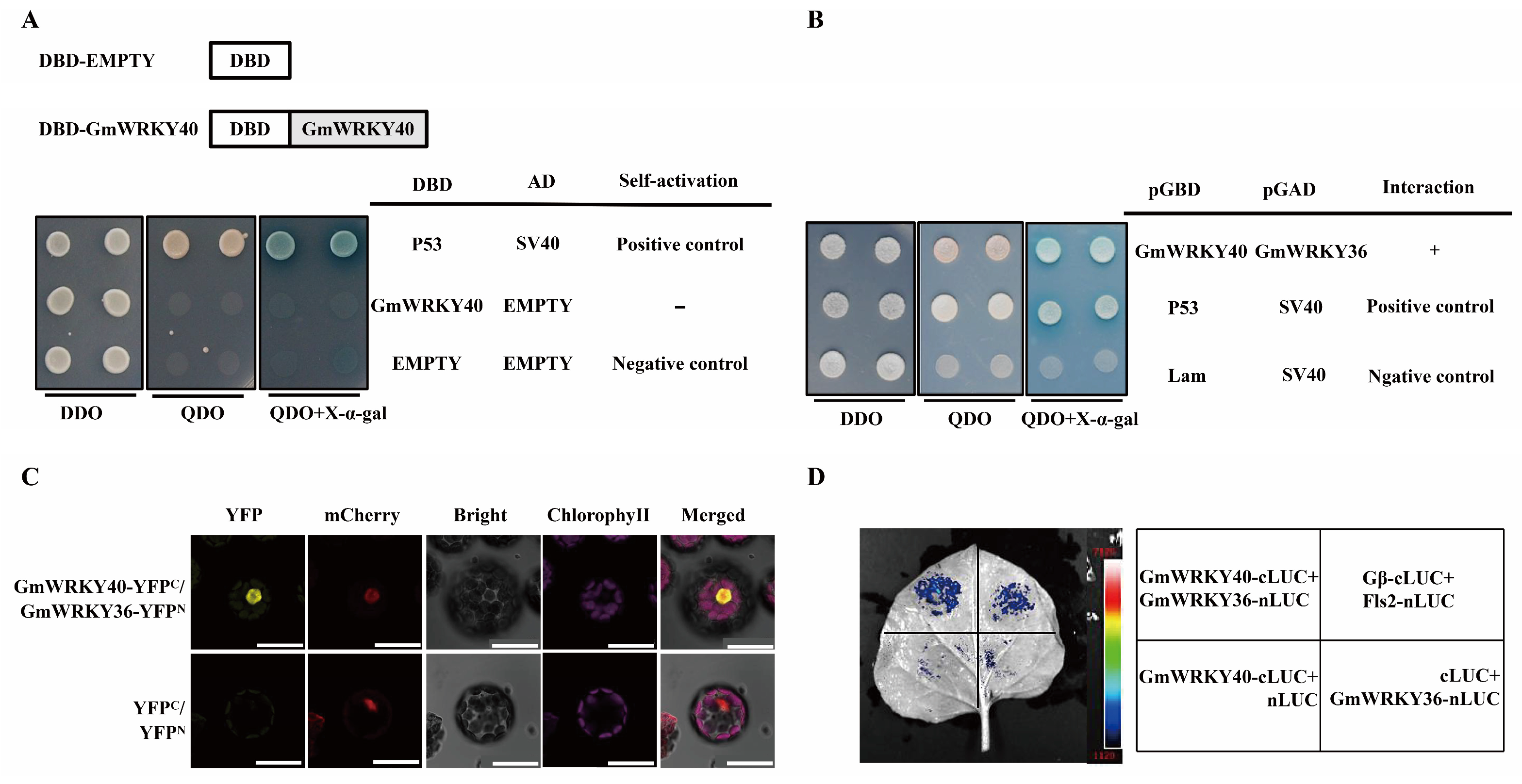 Figure 5. The Interaction of GmWRKY40 and GmWRKY36. (A) The analysis of self-activation activity of GmWRKY40. (B) The yeast two-hybrid analysis of GmWRKY40 and GmWRKY36. (C) The interaction between GmWRKY36 and GmWRKY40 was demonstrated by BiFC, using the YFPN/YFPC pair as a negative control (Scale bar, 25 µm). (D) The interaction between GmWRKY40 and GmWRKY36 was confirmed by SLCA, using the known Fls2-nLUC/Gβ-cLUC interaction as a positive control.