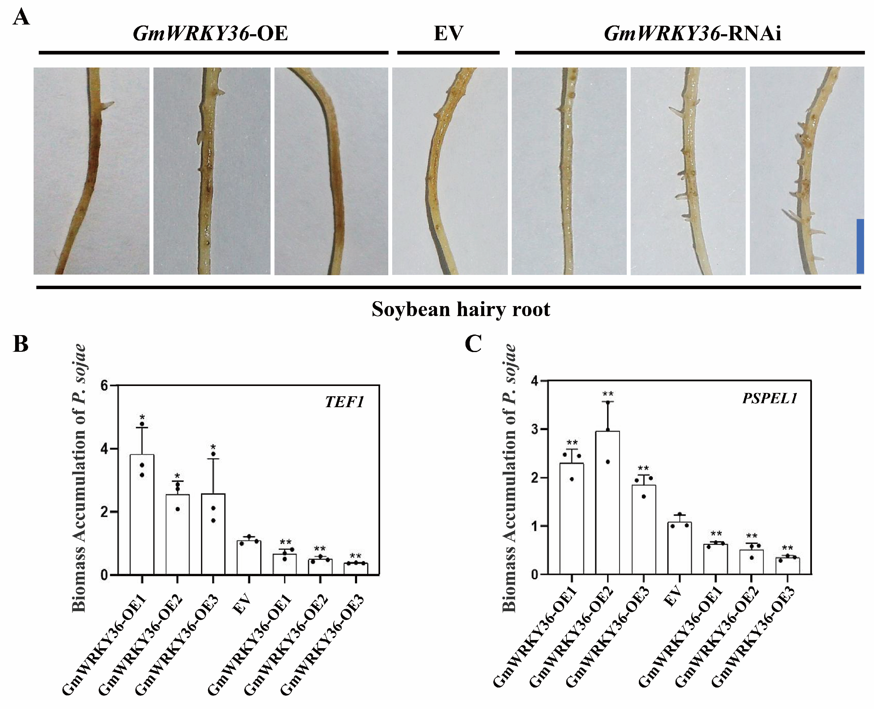 Figure 6. GmWRKY36 negatively regulates soybean resistance to P. sojae. (A) The disease phenotypes of soybean hairy roots expressing an empty vector (EV), GmWRKY36-OE, or GmWRKY36-RNAi at 72 h post-inoculation (hpi) with P. sojae. The blue bar indicates the scale bar (0.5 cm). (B,C) The relative P. sojae biomass in the indicated roots, quantified by RT-qPCR using the fungal (B) TEF1 and (C) PSPEL1 genes as markers. Fungal gene expression was normalized to soybean GmEF1β and GmTUB4. Data are presented as mean ± SD (n = 3 biological replicates). The data were confirmed to follow a normal distribution. Asterisks denote significant differences from the EV control via Student’s t-test (* p < 0.05, ** p < 0.01).