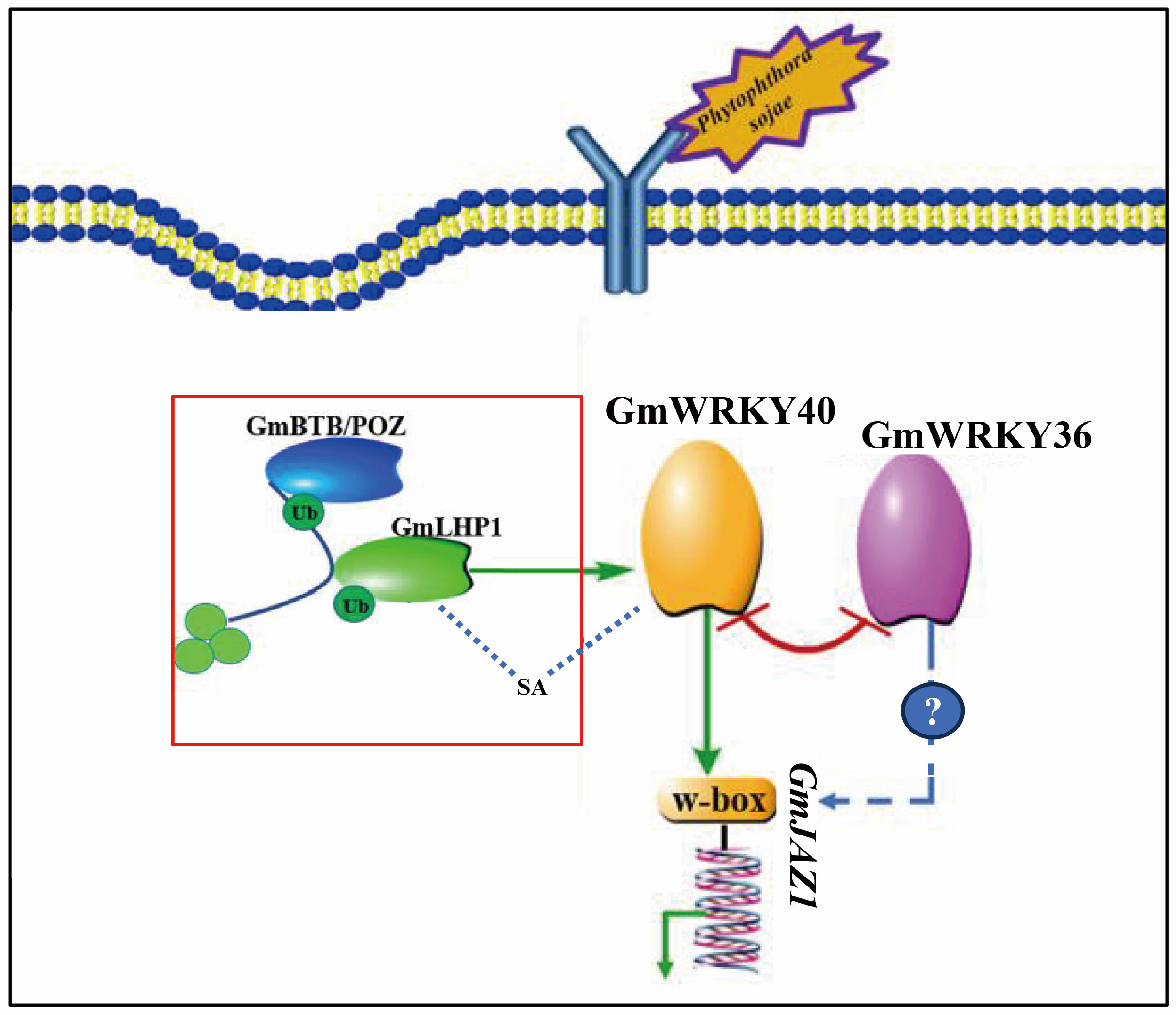 This study reveals that GmWRKY40 confers resistance to P. sojae in soybean by activating the jasmonic acid (JA) pathway through the direct repression of GmJAZ1, while also engaging in an antagonistic interaction with the P. sojae-negative regulator GmWRKY36. These findings elucidate a critical regulatory axis controlling disease resistance and provide key targets for engineering durable resistance in soybean.