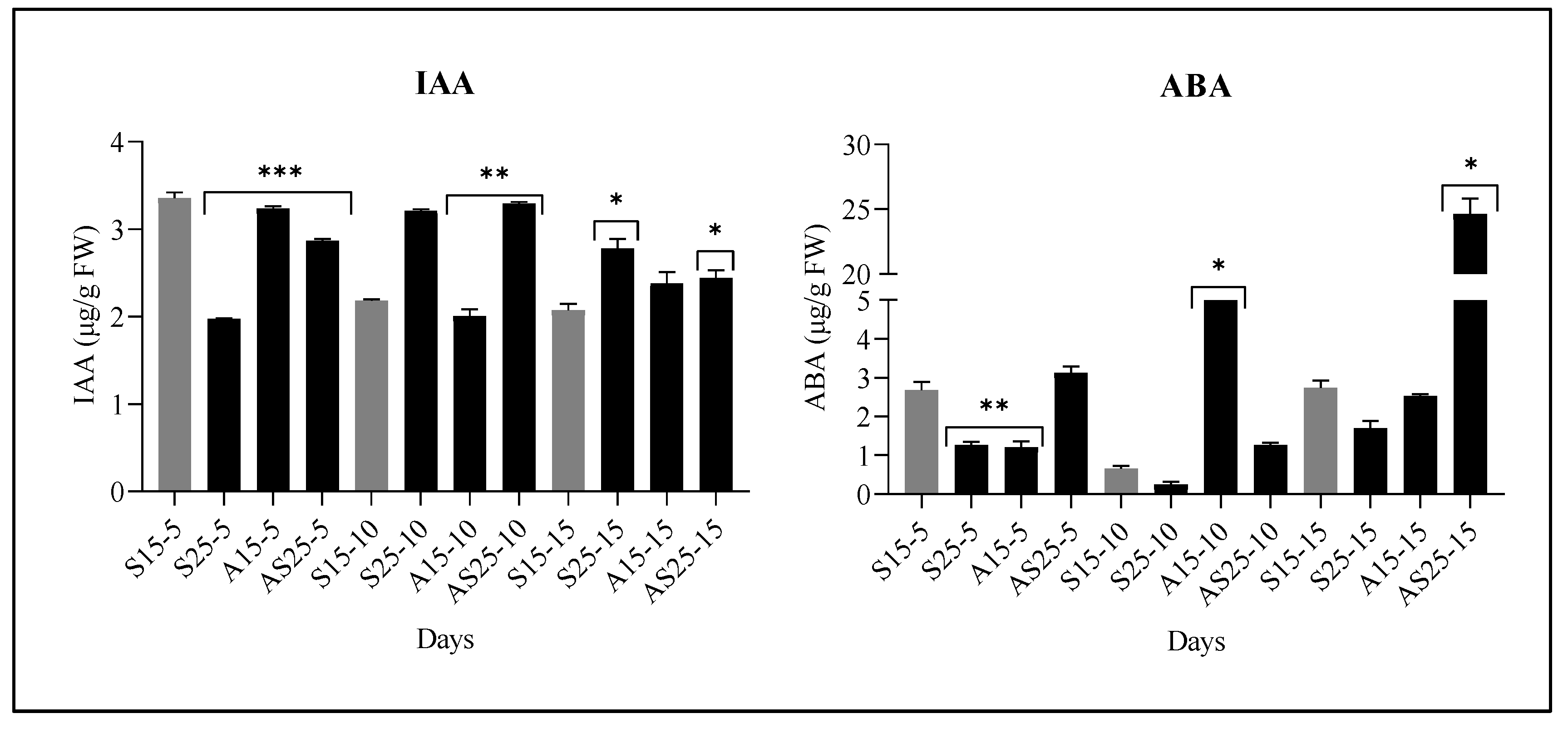 2.2. Phytohormone (IAA and ABA) Content Determination