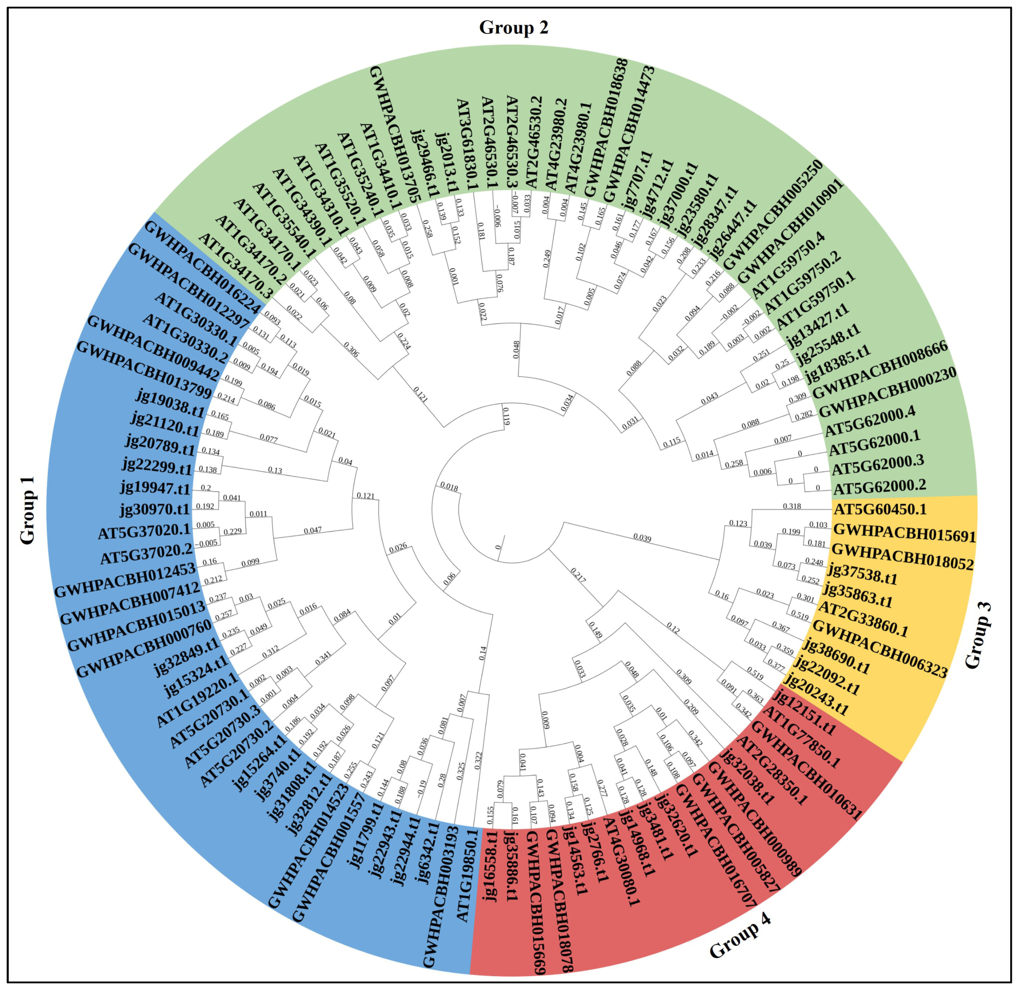 2.4. Phylogenetic Analysis, Conserved Motifs, and Gene Structure Assessment
