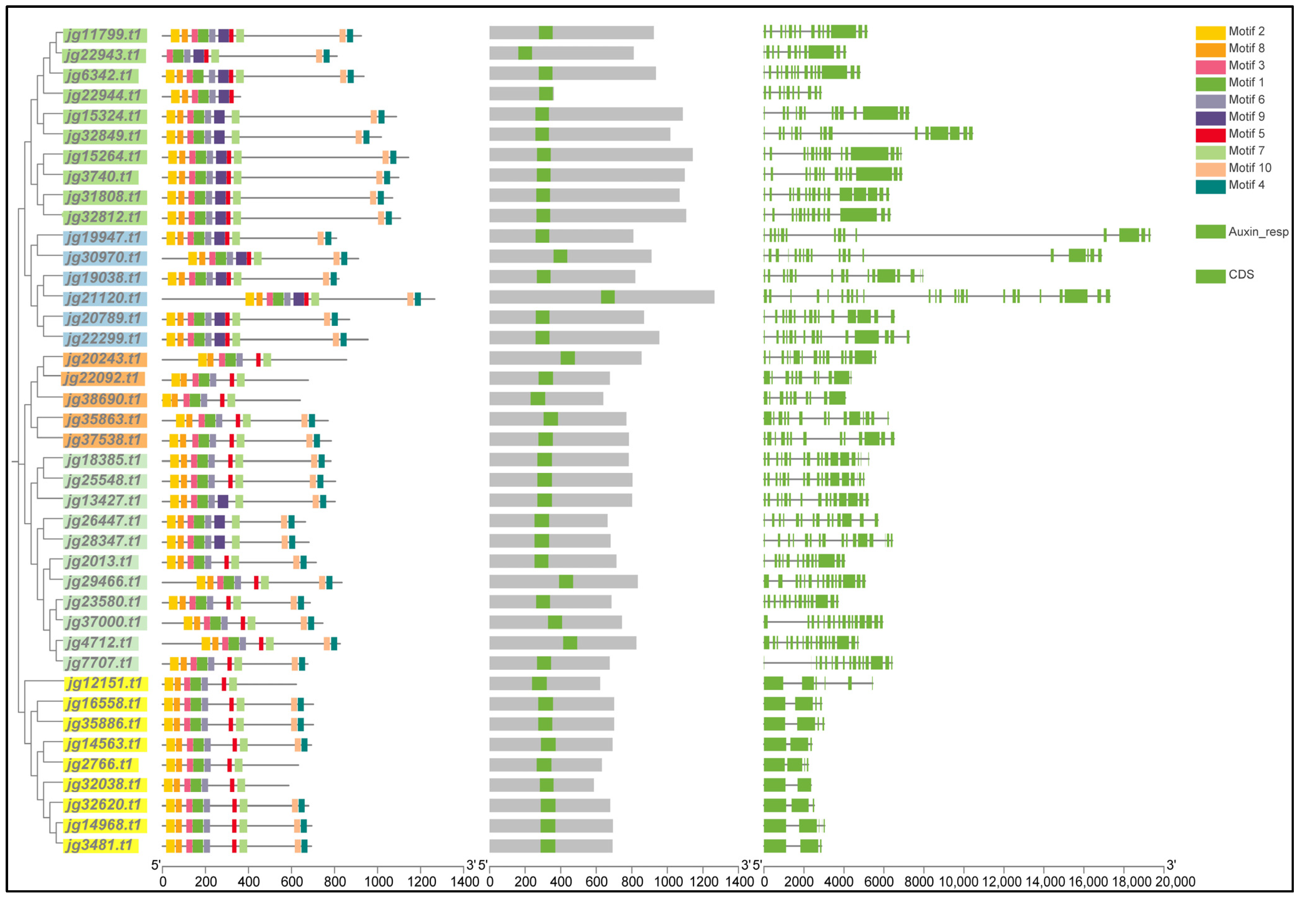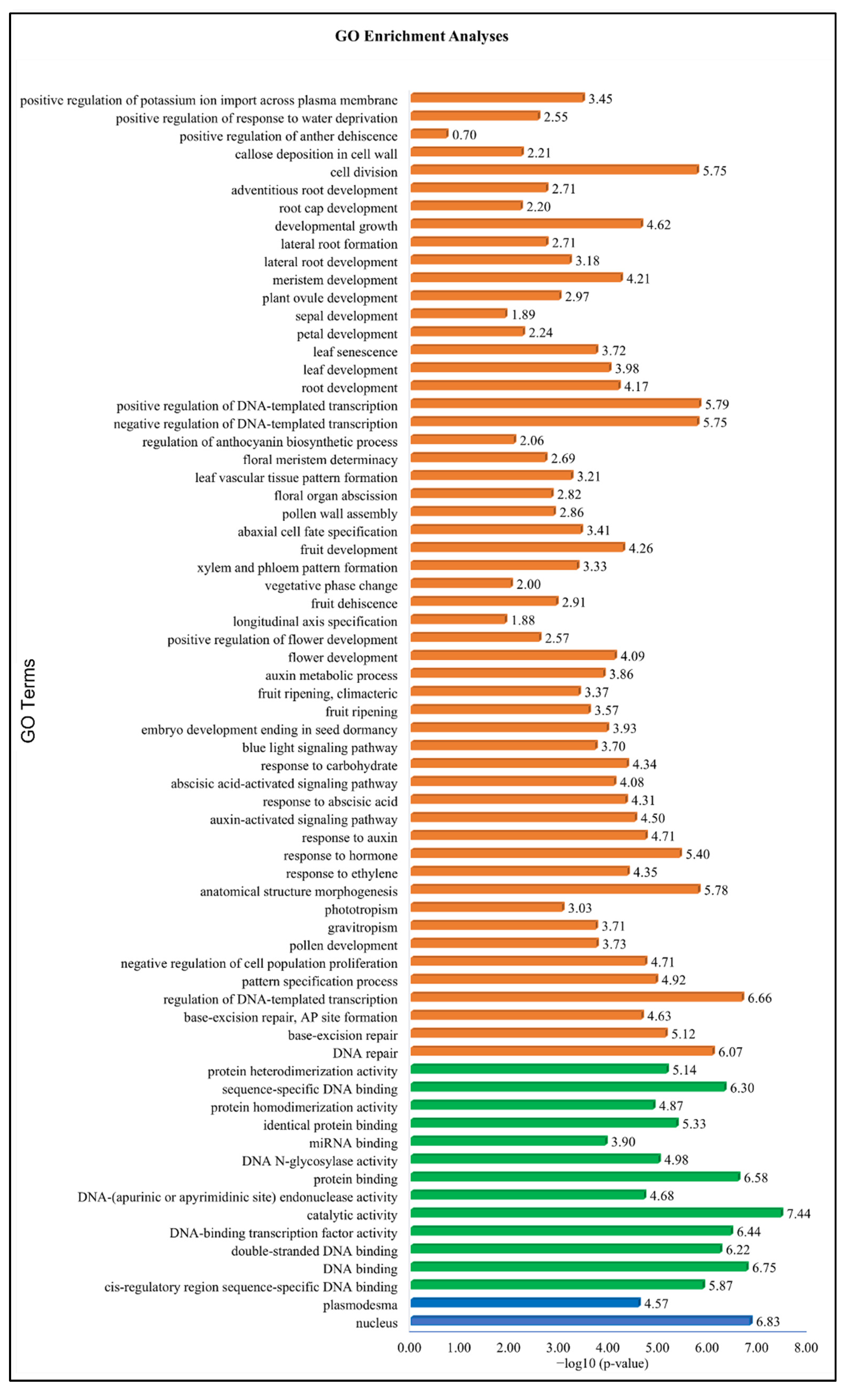 - Diao, D.; Hu, X.; Guan, D.; Wang, W.; Yang, H.; Liu, Y. Genome-Wide Identification of the ARF (Auxin Response Factor) Gene Family in Peach and Their Expression Analysis. Mol. Biol. Rep. 2020, 47, 4331–4344. [Google Scholar] [CrossRef]