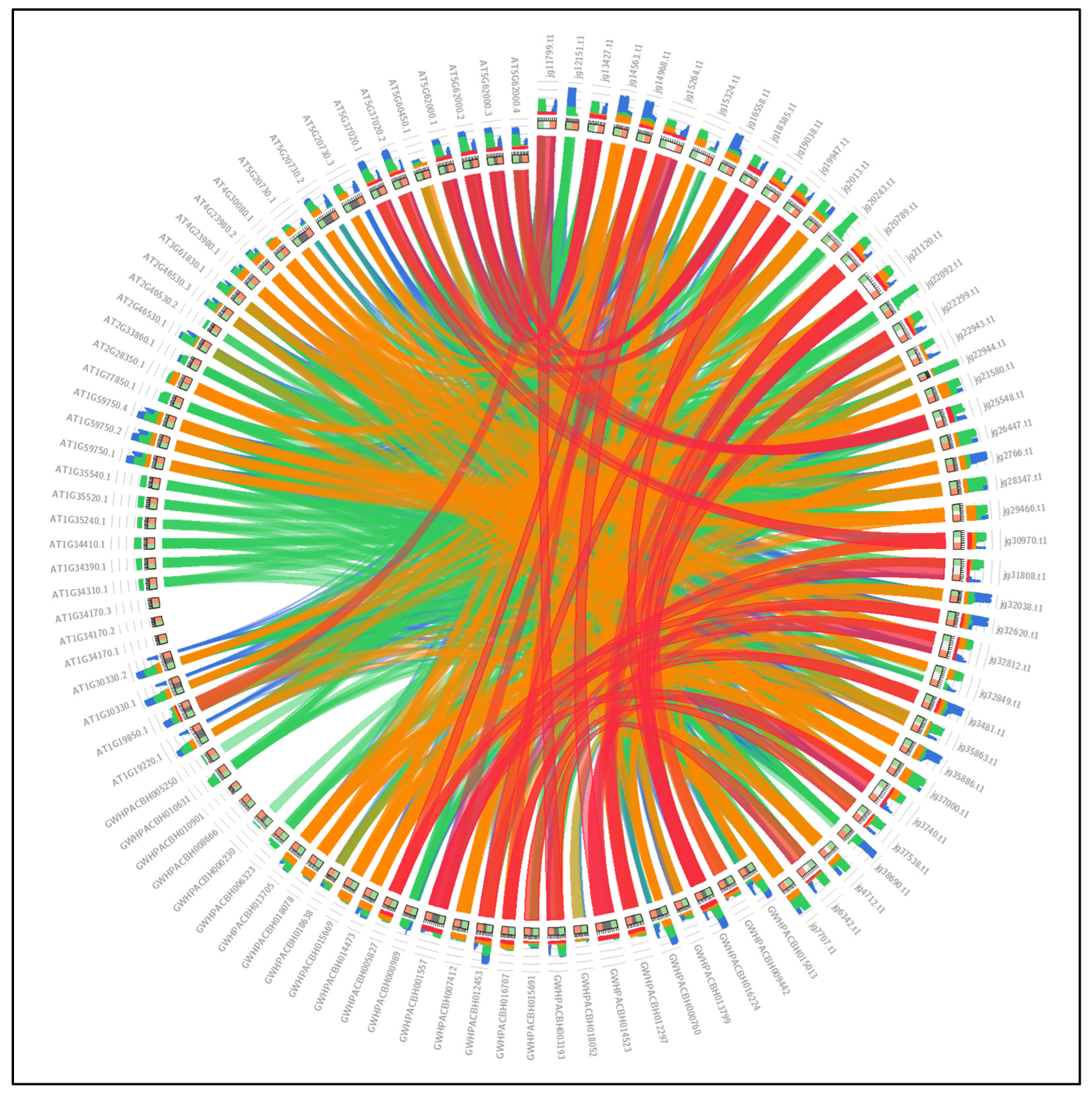 2.8. Collinearity, Ka/Ks Ratios, and Protein Similarities of AmARFs