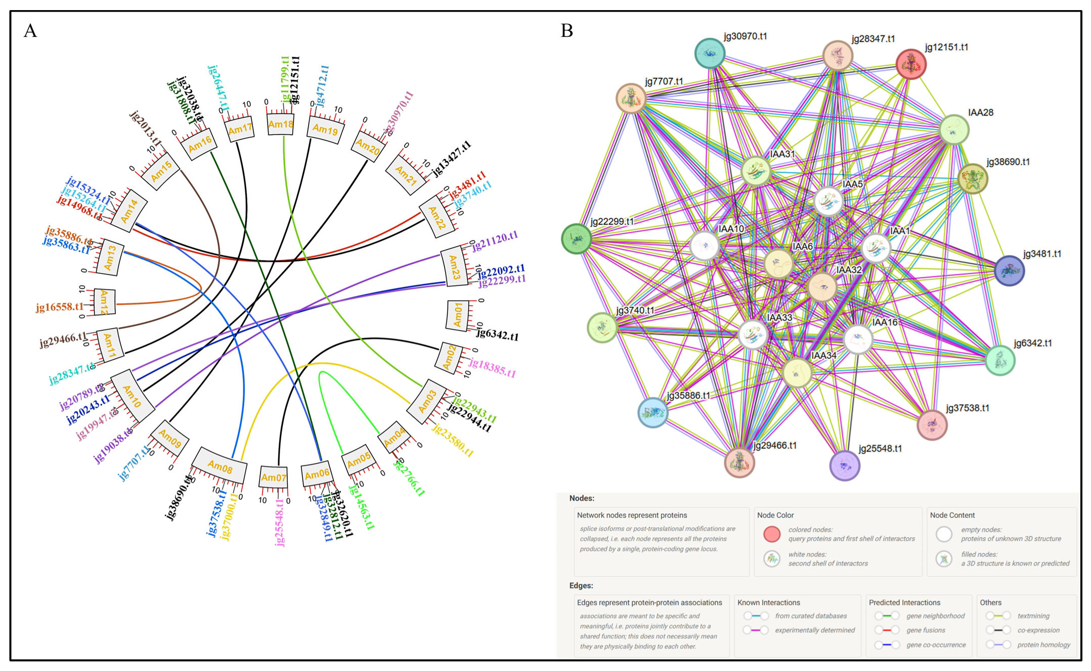 3.10. Chromosomal Localization, Duplication Analysis, and Protein–Protein Interaction of the ARF Genes in A. marina